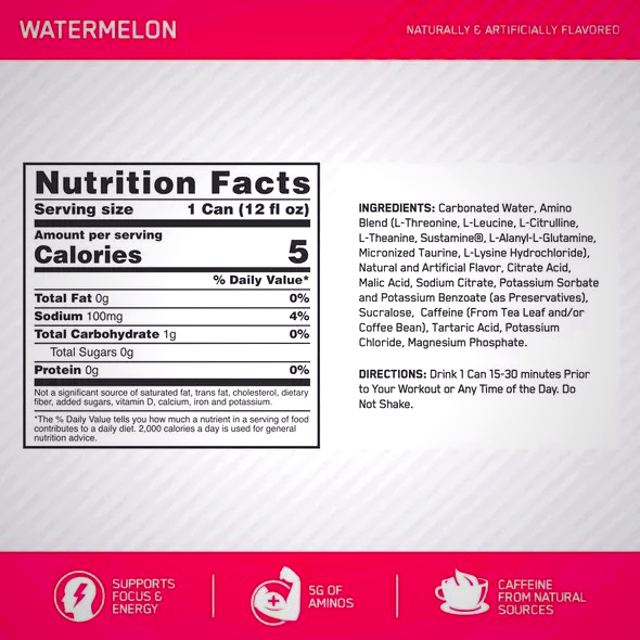 Optimum Nutrition Essential Amino Energy Drink delivers a great-tasting boost of anytime energy for wherever your day takes you. This sparkling hydration drink combines 5 grams of amino acids, 100 mg of natural caffeine, and essential electrolytes to support hydration and active living. Available in refreshing grape flavor!