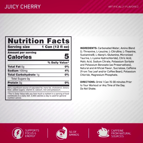 Optimum Nutrition Essential Amino Energy Drink delivers a refreshing burst of energy and hydration whenever you need it. This sparkling grape-flavored beverage combines 5 grams of amino acids, 100mg of natural caffeine, and essential electrolytes to fuel your active lifestyle. Enjoy this zero-sugar energy drink before workouts, during afternoon slumps, or anytime you need an extra boost.