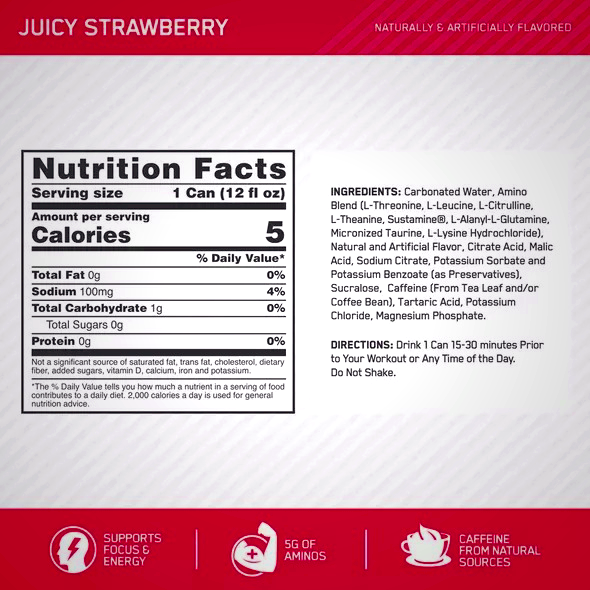 Optimum Nutrition Essential Amin.O. Energy + Electrolytes is a great-tasting sparkling hydration drink that delivers anytime energy for your active lifestyle. Each serving provides 5 grams of amino acids, 100 mg of natural caffeine, and essential electrolytes to support hydration and energy needs. Available in refreshing fruit flavors including Juicy Cherry!