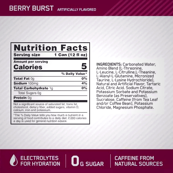 Optimum Nutrition Essential Amino Energy Drink delivers a great-tasting boost of anytime energy for wherever your day takes you. This sparkling hydration drink combines 5 grams of amino acids, 100 mg of natural caffeine, and essential electrolytes to support hydration and active living. Available in refreshing Juicy Strawberry flavor!