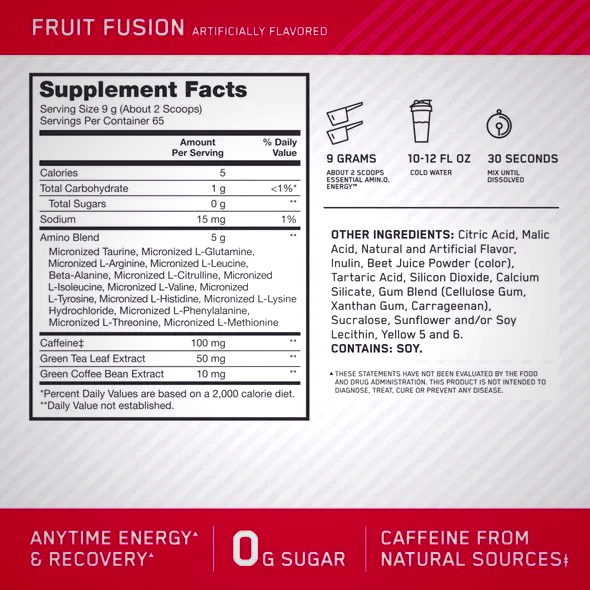 Optimum Nutrition ESSENTIAL AMIN.O. ENERGY delivers a powerful blend of natural energy and muscle recovery support. Each serving provides 100 mg of caffeine from natural sources to boost energy and focus, plus 5 grams of amino acids for optimal muscle recovery¹. Perfect for pre-workout, post-workout, or anytime you need a clean energy boost without sugar or excess calories.