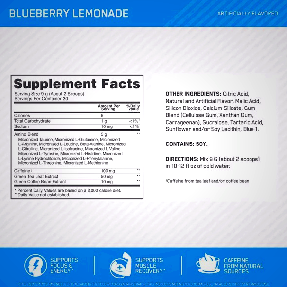 Optimum Nutrition ESSENTIAL AMIN.O. ENERGY delivers the perfect combination of energy and muscle support. Each serving provides 100 mg of natural caffeine from coffee bean and/or tea leaf extracts to boost energy and focus, plus 5 grams of amino acids for optimal muscle recovery support.¹