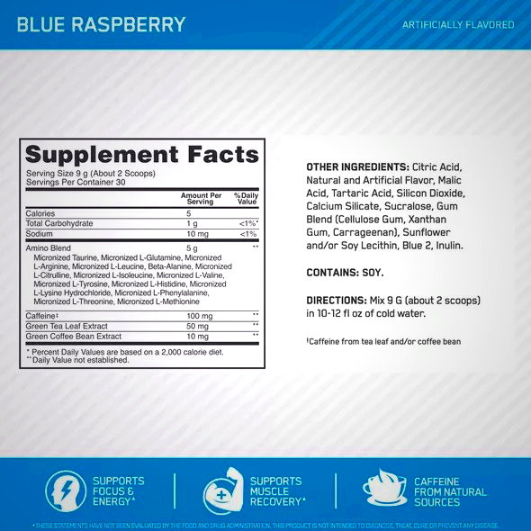 Mix up ESSENTIAL AMIN.O. ENERGY anytime you want a boost of energy, focus and muscle recovery support. Each serving provides 100 mg of caffeine from natural sources to support energy and focus along with 5 grams of amino acids for muscle support.¹