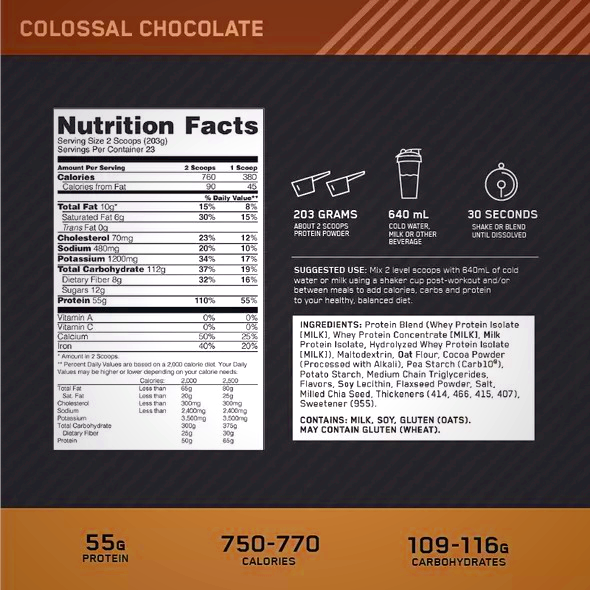 Size is an advantage in many sports, but some athletes have a hard time gaining weight. You can only eat so much food, so we formulated GOLD STANDARD GAINERâ„¢ with quality calories in a 2:1 ratio of carbohydrates to proteins. Each full-sized serving weighs in at 763 calories with 55 g of high quality complete dairy proteins, mostly from isolate sources to help you grow bigger and stronger when taken in conjunction with an exercise program. The carbohydrate blend includes oat, pea and potato, and the fats include medium chain triglycerides, chia and flax. We took it a step further by making the powder easy to mix in a shaker cup. No blender needed. There is no doubt that GOLD STANDARD GAINERâ„¢ raises the bar for weight gain performance.
