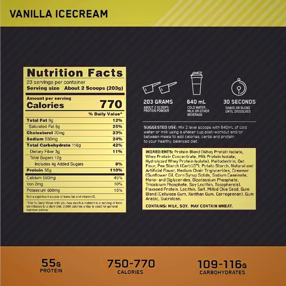 Size is an advantage in many sports, but some athletes have a hard time gaining weight. You can only eat so much food, so we formulated GOLD STANDARD GAINERâ„¢ with quality calories in a 2:1 ratio of carbohydrates to proteins. Each full-sized serving weighs in at 763 calories with 55 g of high quality complete dairy proteins, mostly from isolate sources to help you grow bigger and stronger when taken in conjunction with an exercise program. The carbohydrate blend includes oat, pea and potato, and the fats include medium chain triglycerides, chia and flax. We took it a step further by making the powder easy to mix in a shaker cup. No blender needed. There is no doubt that GOLD STANDARD GAINERâ„¢ raises the bar for weight gain performance.